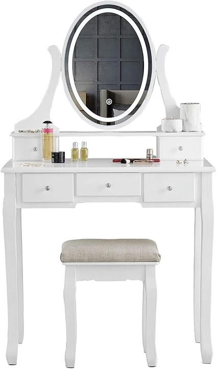 Dressing table with mirror and stool. This is a stunning white dressing table with a round lighten mirror, let it realize your princess dream! * saving applied will be apportioned across all qualifying items. Dressing tables offer extra storage and are a great place for keeping all the necessary accoutrements needed (or not!) for keeping you choose from a modern dressing table with a surface that rises to offer you a viewing glass revealing more storage space, to a dressing table with the mirror standing. This lighted vanity table with huge mirror is the best vanity for your bedroom makeup and hair salon.