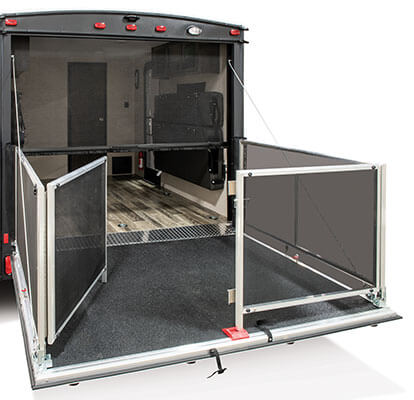 Transform the trailer ramp door into an entertainment space in seconds — simply fold out the steel patio kits and snap it into place. Happijac queen bed in garage area. Patio package on livin lite toy haulers xtend a room toy hauler patio rv patio package on livin lite toy haulers fencing for rear ramp to use as a patio. 2018 cruiser stryker 3513 camper. Patio railing kits get the party started with the redesigned rv ramp door patio railing kits.